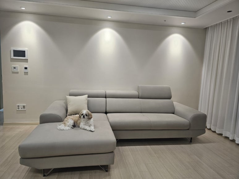 이번에 거실 조명등을 갈면서 오래된 쇼파도 함께 바꾸기로 마음먹고 고민을 많이 했습니다. 화이트톤으로 거실이 리모델링이 되었기에, 쇼파도 너무 부담스럽지 않고 깔끔한 느낌을 찾고 있었어요! 강아지를 키우고 있어서 미끄럽지 않으면 더더욱 좋고요! 그러다가 딱 발견했는데, 보자마자 이거다! 싶어서 바로 주문 시켰습니다. 근데 웬걸! 너무 상상하던 그대로 왔네요!!! 쇼파 하나 들였다고 거실이 너무 깔끔하고 넓어졌어요. 색도 부담스럽지 않게 고급스럽고 무엇보다 기대안했던 단단한 쿠션감이 너무 좋더라고요. 쿠션도 색 맞춰서 주문했더니 인테리어에 8할은 이 친구가 하는 거 같네요! 전체적으로 너무 만족합니다!!